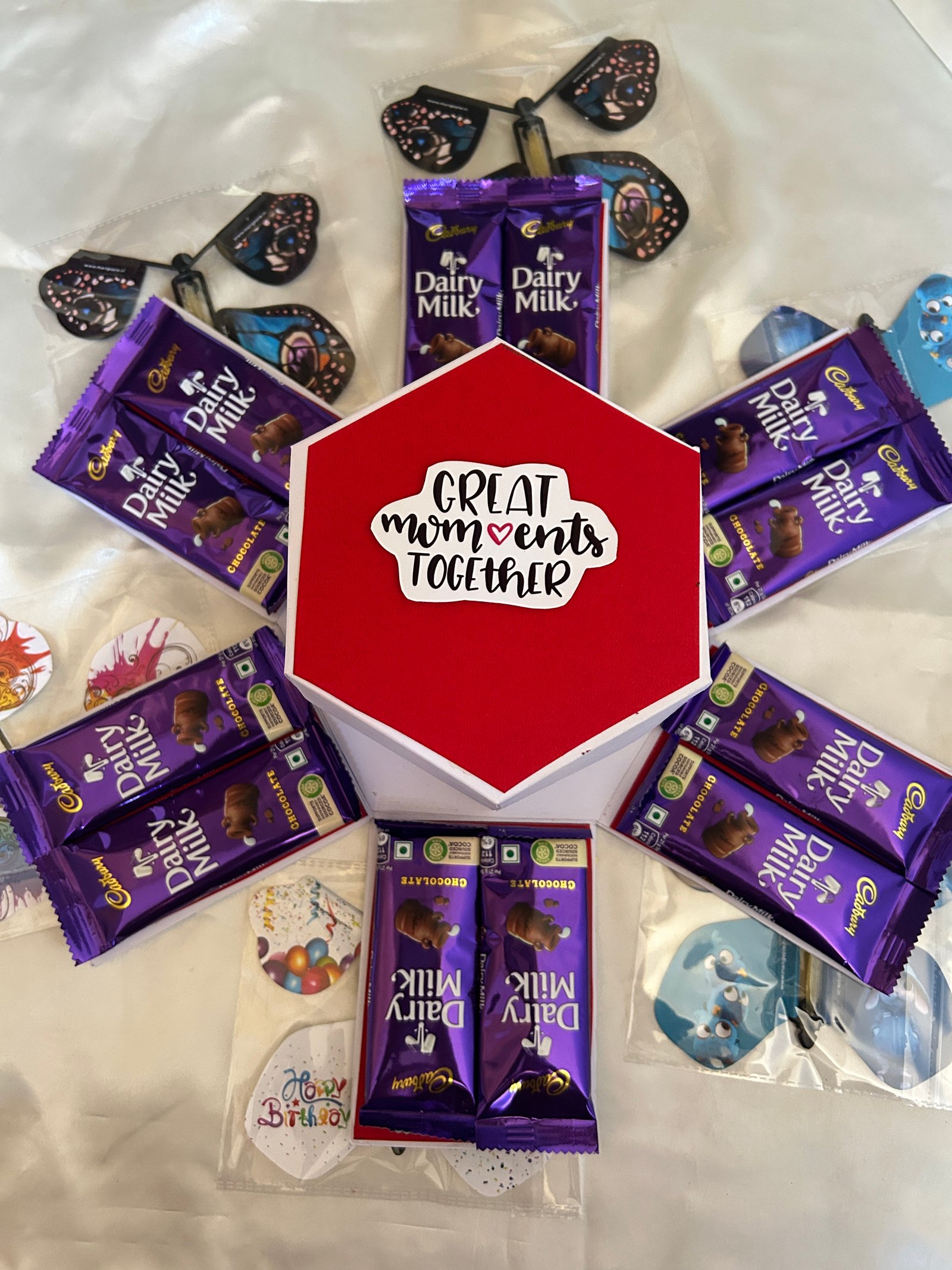 Unique pull-up photos opening for a surprise reveal , Filled with rich, indulgent chocolates , Sturdy, premium-quality gift box with butterfly artwork , Elegant and reusable packaging.